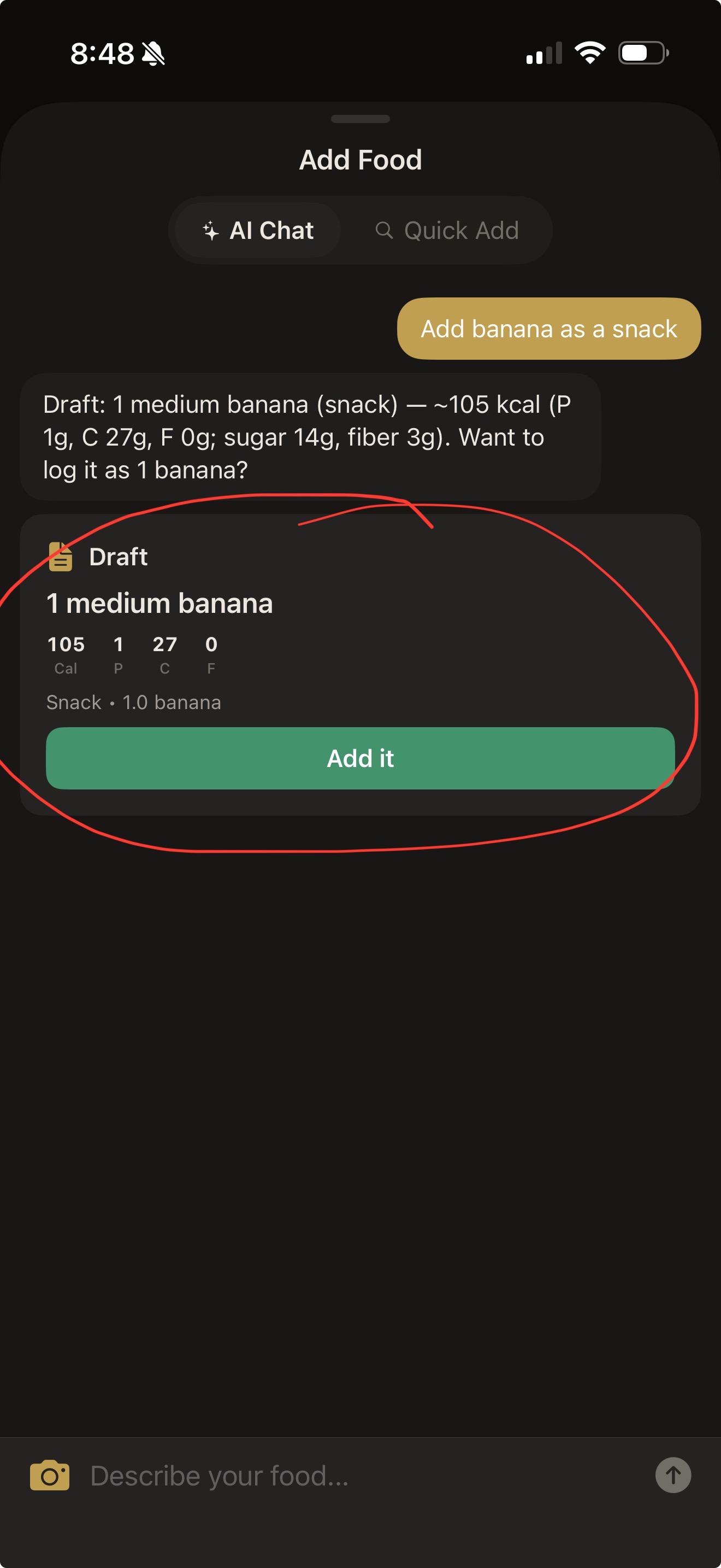 When you tell AI to add a food. It comes back with a response card and says add. Can we edit that directly before hitting add instead of telling ai to edit it. So we can edit all the fields in the box? fitness app see screenshot. Check if we can do that on the dash website. If not this change needs to happened at the backend so when we hit gateway api from either both get this change. Make sense?